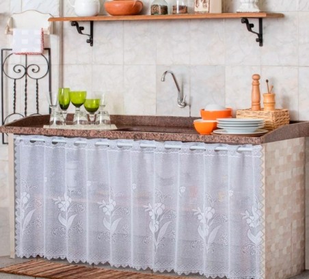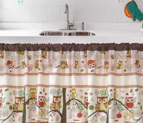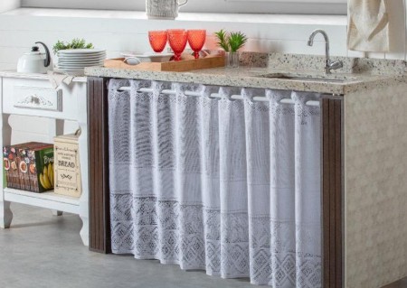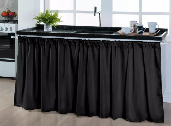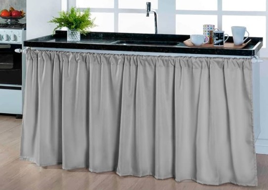 - Organização visual do espaço: A cortina esconde o que fica embaixo da pia, deixando a cozinha com aparência mais arrumada;