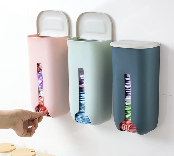 Existem modelos próprios com abertura superior e inferior. Você coloca as sacolas por cima e retira uma por vez pela parte de baixo, sem gerar aquela bagunça.