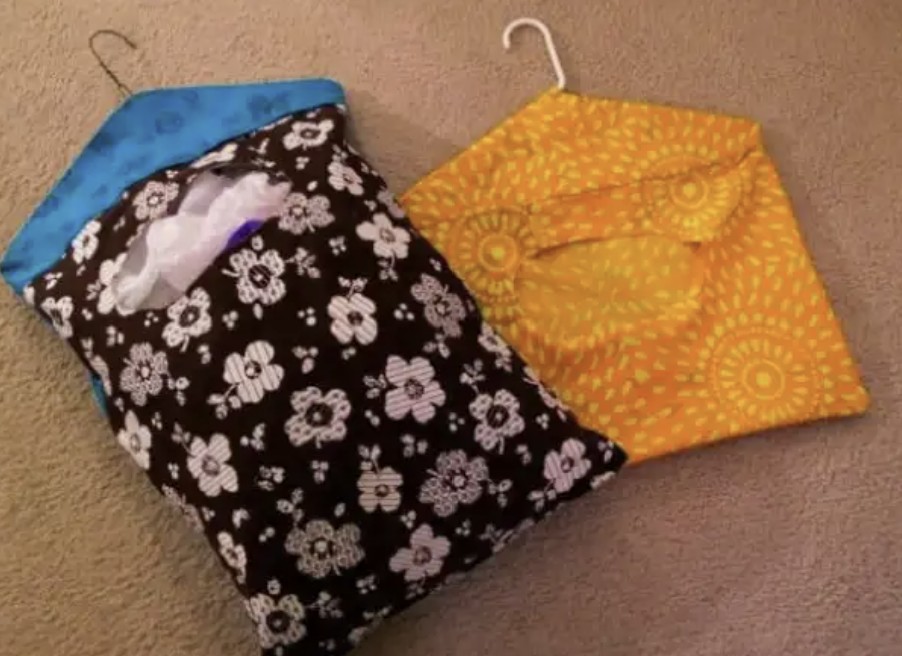 Costure a parte de baixo, coloque elástico nas duas pontas e pendure em local de fácil acesso. É uma solução criativa e econômica.