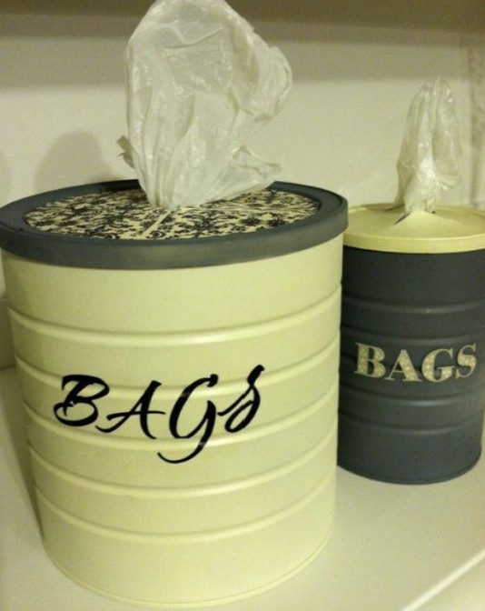 Latas de panetone, leite em pó ou café servem bem para esse uso (guardar as sacolas) e ainda decoram sua cozinha.
